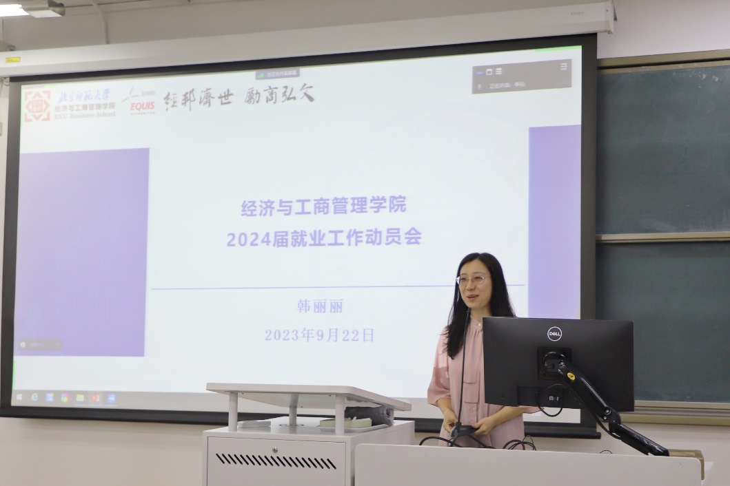韩丽丽老师从近几年就业形式出发,帮助同学们了解当前较为严峻的形势以及我校毕业生的主要去向,接着向同学们介绍了经管学院就业工作进展和就业工作体系,劝勉同学们善用官方公众号信息关注就业资讯、利用学院平台积极参与就业活动、借助校友资源了解行业资讯,并表示学院将始终从学生需求出发,切实做好服务和引导工作。