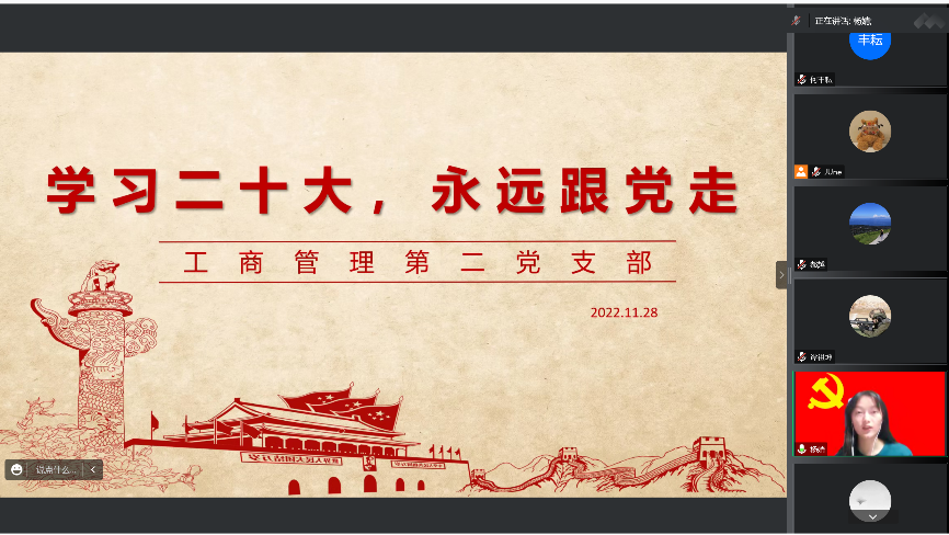 2022年11月28日,欧洲杯 工商管理第二党支部召开全体党员大会,讨论谭祖坤同志和刘思瑶同志的转正事宜,并进行党的二十大报告专题学习。受疫情影响,经学院党委批准,本次会议采用腾讯会议的形式召开,会议应出席有表决权正式党员9名,实出席有表决权正式党员9名,支部书记史玖琦同志主持会议。