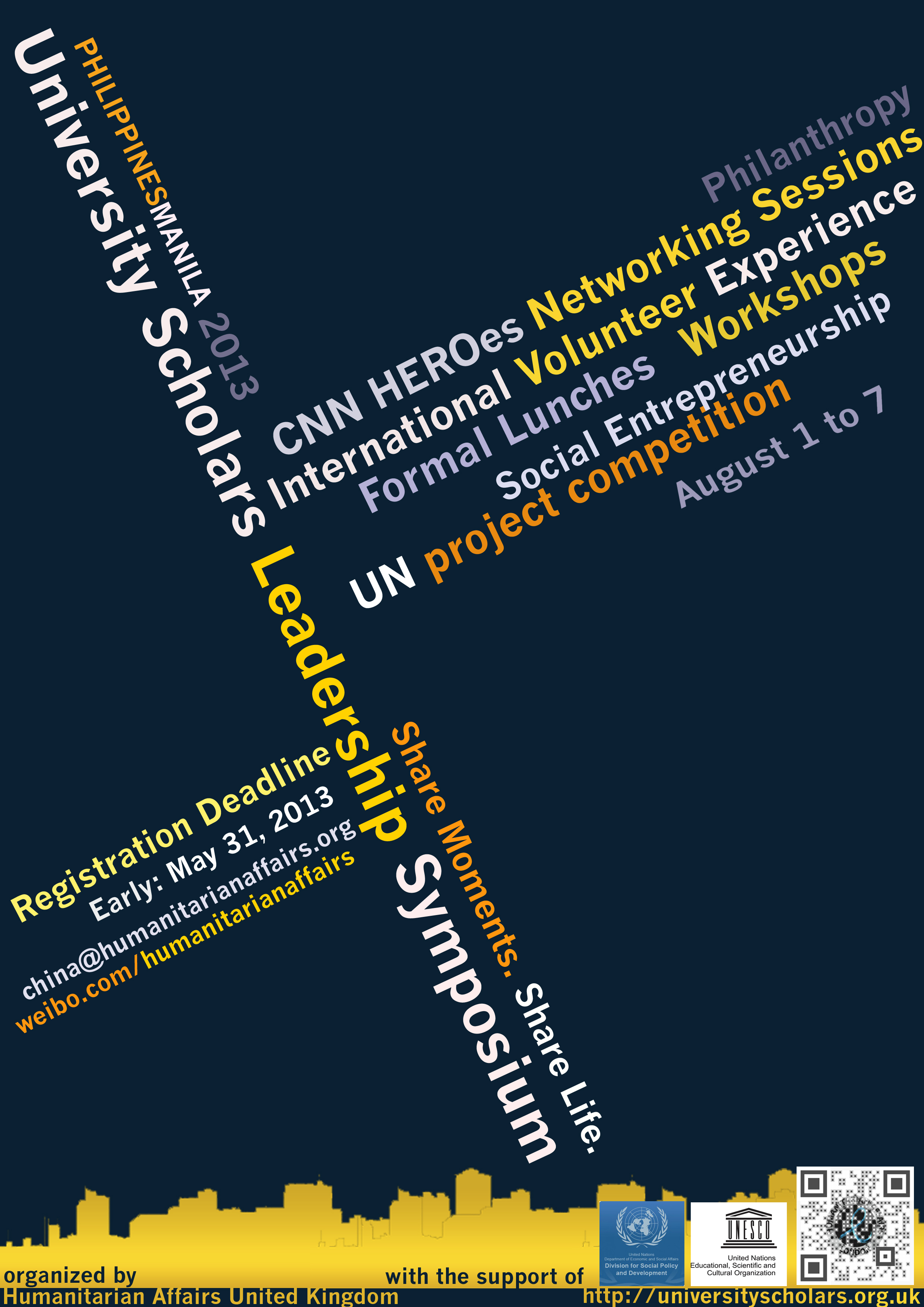 通过选拔将参与今年的全球青年领袖论坛,此届论坛是在菲律宾政府,联合国经济和社会事务部(UN DESA)以及联合国人道主义事务协调办公室(OCHA)的支持下由英国公益事务机构主办的。会议旨在在国际竞争日益激烈下的今天为青年人提供在世界的舞台上获得认可与荣誉的机遇,提升青年人提升国际社会责任意识、自我推动力,以及领导能力。