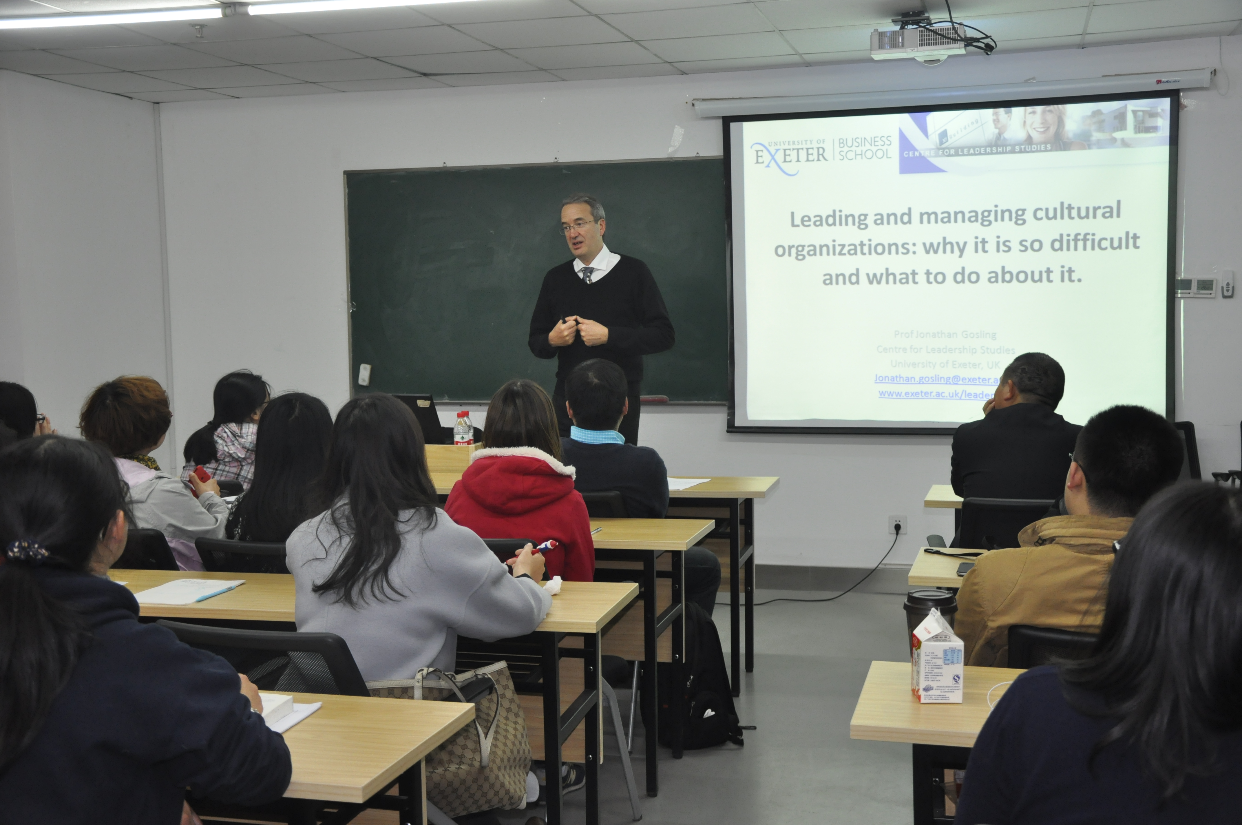 MBA中心主办的文化创意产业管理系列论坛第三讲在京师大厦9408成功举办。本次讲座的主讲人为英国埃克塞特大学(University of Exeter)商学院Jonathan Gosling教授,主题是“领导和管理文化组织:为什么它是如此之难及如何应对它”,主持人为欧洲杯