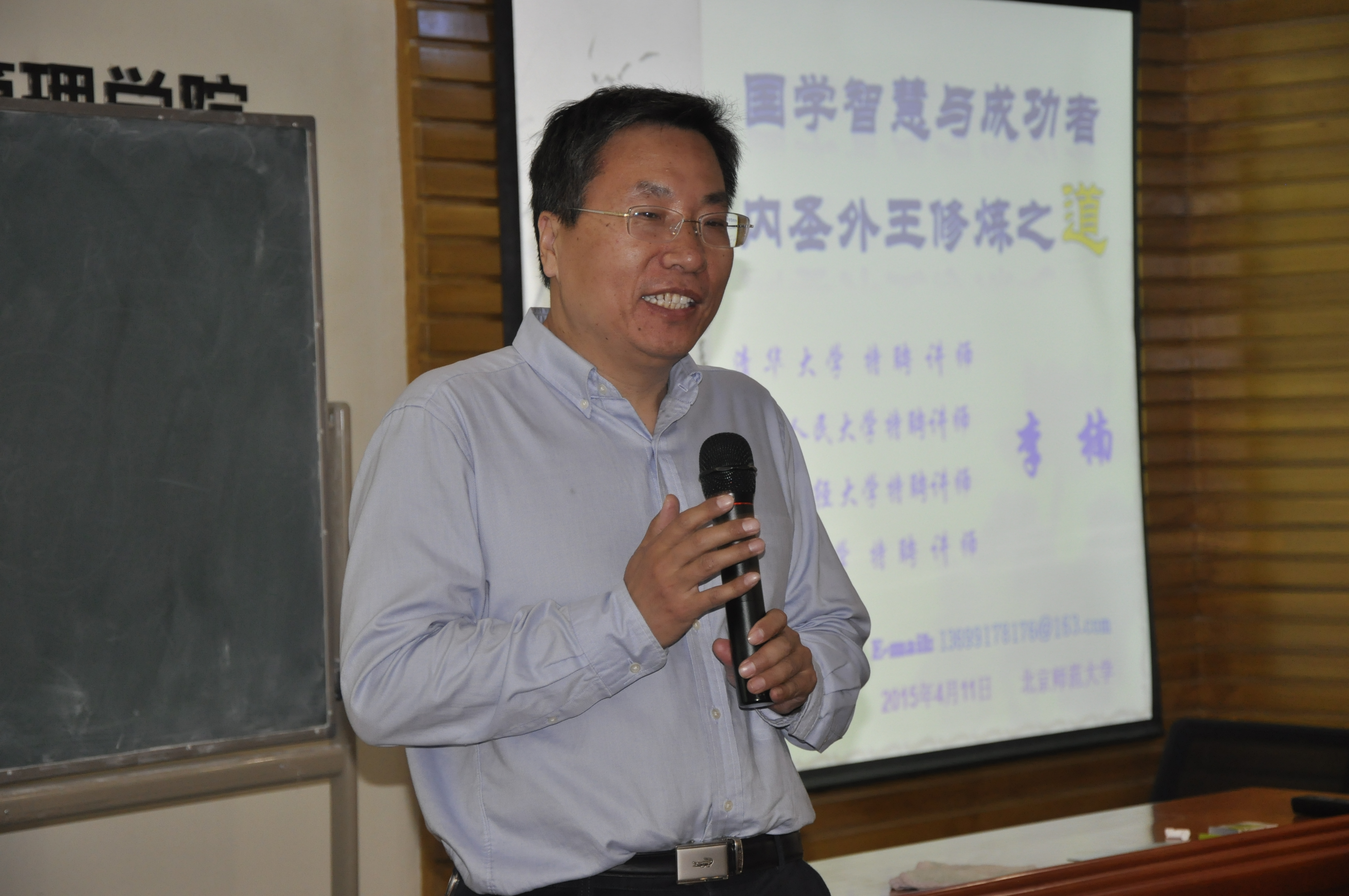 讲座一开始,李楠老师就引用南怀瑾的“佛为心,道为骨,儒为表,大度看世界;技在手,能在身,思在脑,从容过生活”的名言开场,一下子把听众拉到了国学经典文化的氛围当中,并用历史名人事例和智慧小故事来从“明道”、“取势”、“优术”、“树人”“省察”这五方面来全面阐释优秀领导者所具备的素质和能力。接着分析了当今管理界和公司金融界发展的大趋势,并提出了自己对今后市场发展大趋势的预测。最后,提出了作为一名成功的领导者和管理者应保持“空杯”的学习态度、要学会运用“六秒钟法则”等方法合理控制自己的情绪、要远离诱惑、在生活当中应做到“持盈保泰”等建议。