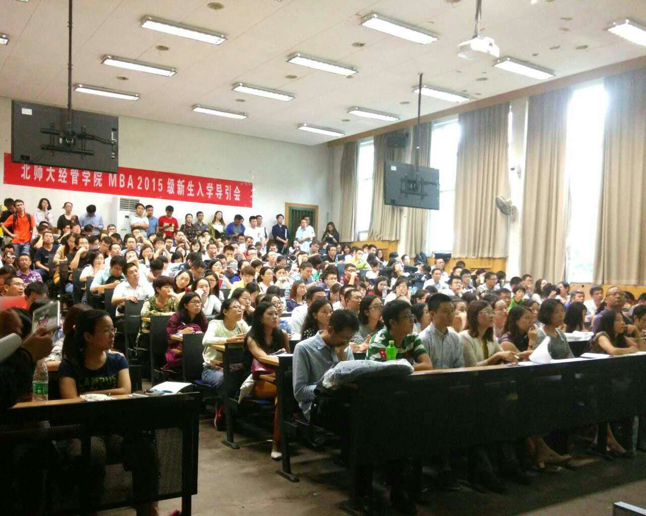 2015年9月6日下午16:00-17:00,北师大MBA2015级新生入学导引会在生地楼第一教室顺利举行。北师大MBA教育中心主任苏凇老师、副主任焦豪老师,中心办公室老师杜静、李婧雅等9名老师和200多名2015级MBA新生参加了此次会议。