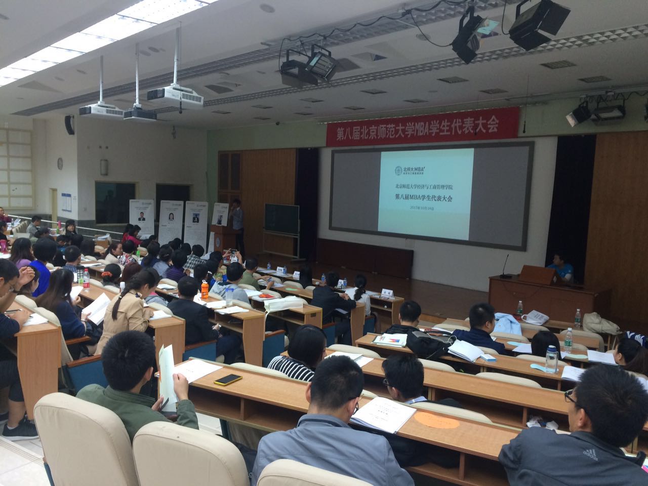 会议由第七届北师大MBA联合会副主席郝文辰同学主持。大会首先由北师大MBA中心王璐璐老师发表了开幕致辞,阐述了联合会工作的重要性,以及对新一届联合会工作的期待;接着,第七届北师大MBA联合会主席宗玲同学对过去一年联合会的工作进行了全面总结汇报。