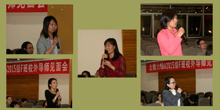 随着最精彩的环节的到来,会议现场气氛有些小激动,同学们都想将憋了许久的问题告诉导师并请导师们给予指点,但又不好意思做“第一个吃螃蟹的人”,最后主持人楚函邀请2015级MBA联合会主席朱振凤同学首先向李振明导师“发难”—咨询总裁助理这个工作岗位究竟是一个什么样工作,是单一性简单工作还是复杂的多面性工作,需要为此岗位做哪些努力和准备?李老师从工作单位的性质入手为朱振凤同学做了详细分析及建议,不仅让朱振凤同学对自己的疑问有了诠释,也让在座其它同学更深入了解了选择不同性质的工作单位对工作岗位的影响力。接下来F班的赵琳娜等诸位同学分别就“工作转型、自己创业、如何将自己的事业与国家倡导的事情有效结合、工作天花板小”等方面的问题向导师们请教,无论是同学们自己的“个性问题”还是能代表大家的“共性问题”,导师们结合自身工作经历与经验一一为同学们给出了中肯的建议,同学们感同身受,掌声不时在会议室中响起,这掌声既是对导师们的无保留的坦诚态度表示感谢,也是同学们为参加今晚的见面会而感到欣喜—见面会没有白来,导师们是开放的,是愿意为同学们的提供帮助,助力我们成长!