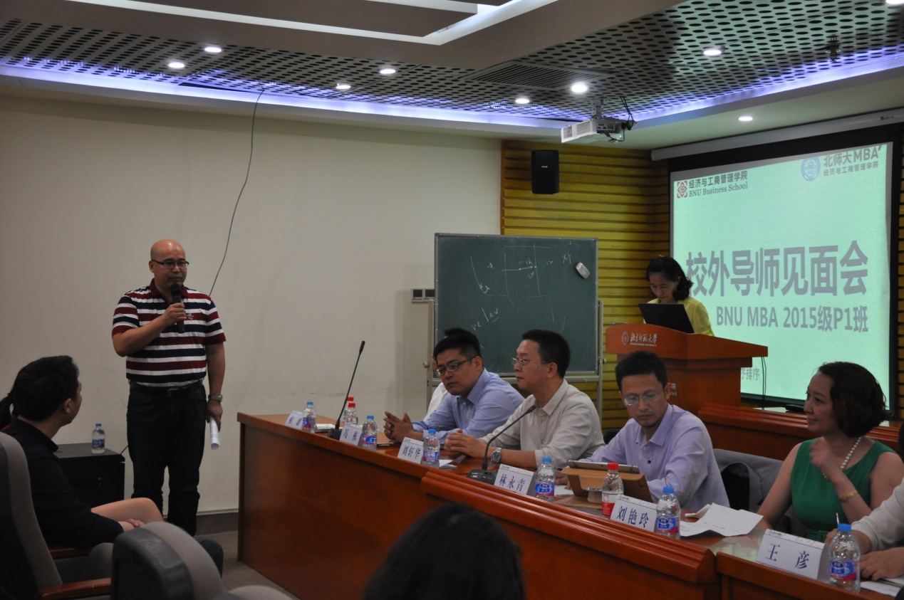 2016年6月5日,一个美丽的日子,2015级P1班校外导师见面会在P1班班委们的精心组织下隆重举行。本次见面会得到MBA教育中心的全力支持,黄良进主任、李婧雅老师和P1班班主任王璐璐老师在百忙之中亲临现场,与P1班及其他各班级30余位同学共同促成见面会的顺利召开。本次见面会光临的校外导师有北京泛融金资产管理有限公司产品总监柏璐、民丰资本投资管理有限公司总裁冯栋、江南财务投资集团董事局主席兼总裁刘轩华、价值中国网创始人兼CEO林永青、北京凯洛格咨询有限公司资深讲师刘艳玲、北京北大纵横管理咨询有限责任公司高级副总裁王彦、北京国鑫控股集团有限公司总经理詹庆辉、华金证券北京呼家楼营业部总经理张孜列席参加。见面会由P1班副班长卢海艳主持,介绍了班级情况。黄良进主任、李婧雅老师也相继介绍了MBA教育中心相关情况、交流校外导师在专硕人才培养过程中起到的重要作用,并向与会导师的到来表示热烈欢迎。