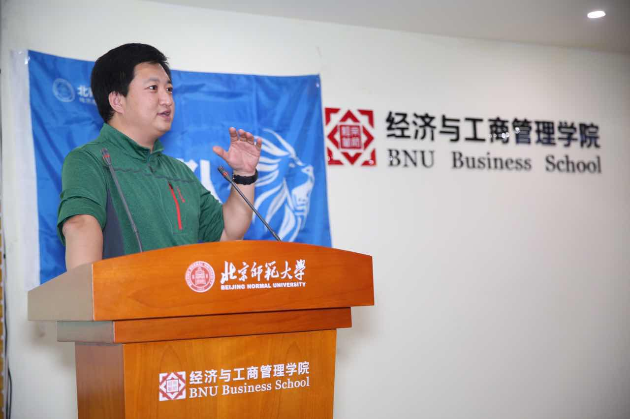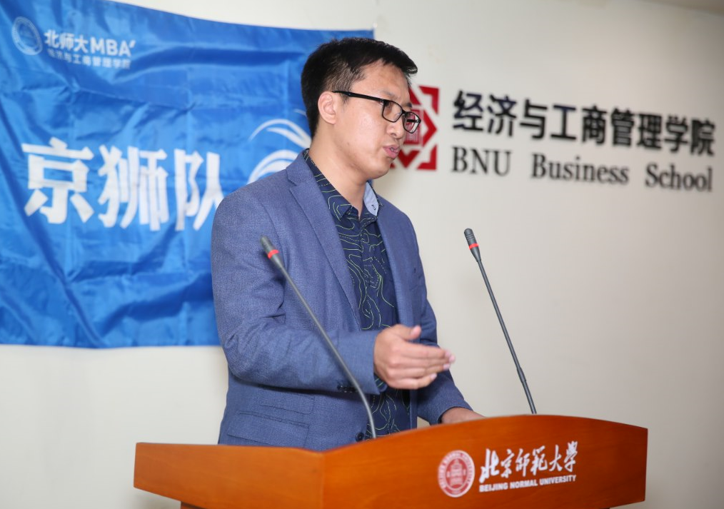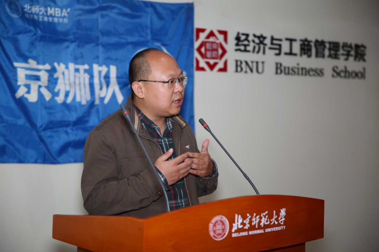 麦麦哒(北京)饮品公司总经理陈轩先生作为MBA校友、沙三沙友的身份回到母校,谈到在北师大MBA的学习期间,自己参与的“第三届亚沙赛”和“尖峰时刻”仍然记忆犹新。尤其提到亚沙赛是一个远离人群去发现,寻找自我、了解自我、与自己内心对话的好机会,并预祝大家取得好成绩。