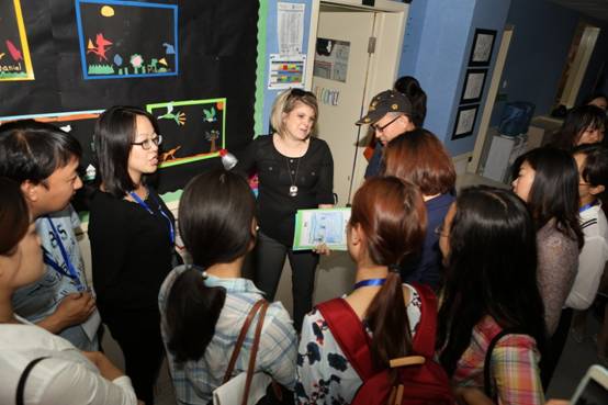 首先,宗玲校友和海嘉工作人员带领北师大MBA师生一行参观了海嘉国际双语学校校区。大家认真听取了接待老师对校区的介绍,兴致勃勃地参观了教学楼、图书馆和体育活动室,对感兴趣的问题进行了探讨和交流。