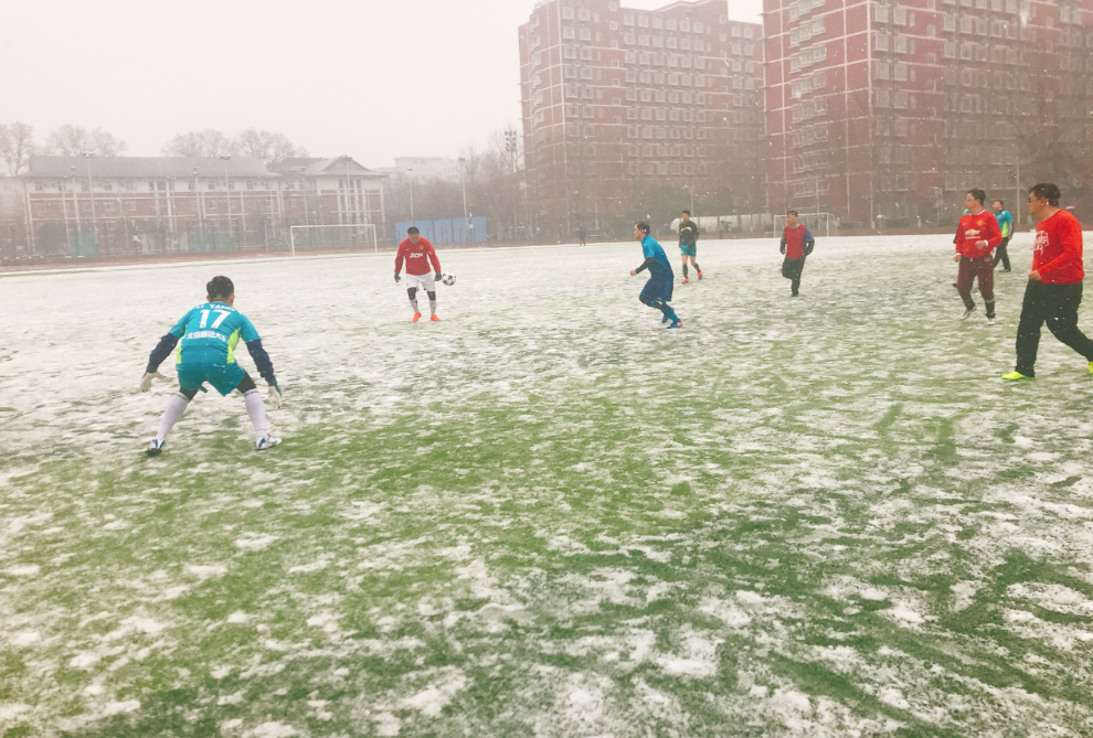 级师兄李晓雷的一声哨响,比赛正式开始,身着蓝色队服的全日制同学和红色队服的非全日制同学,在雪花漫天飞舞的西操场中成了一条靓丽的风景线。随着对雪天场地的不断适应,大家逐渐进入了比赛状态。上半场,全日制队抓住非全日制队两次后防漏洞,通过防守反击分别由姚楠、许猛各进一球,比赛场面十分焦灼。