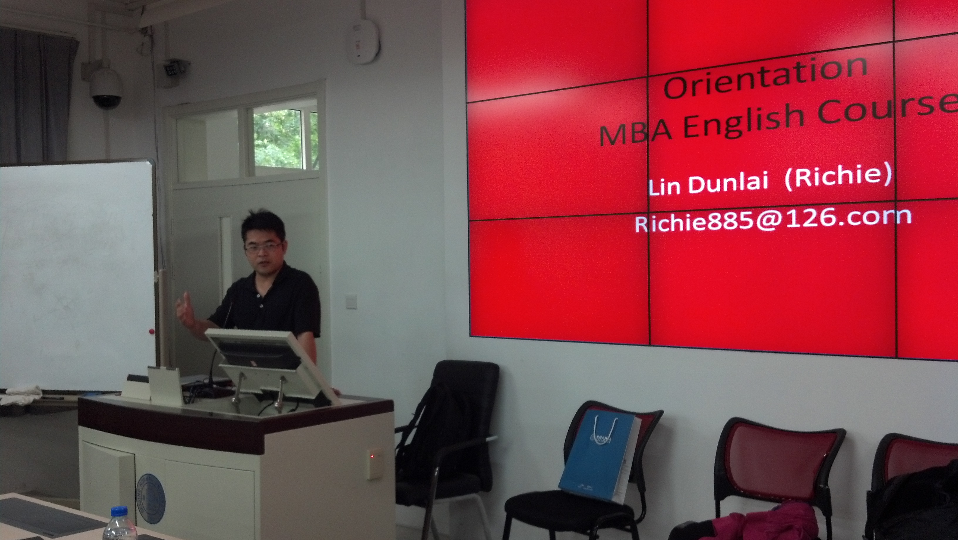 图:北师大MBA教育中心苏凇博士在和2013级脱产新生交流