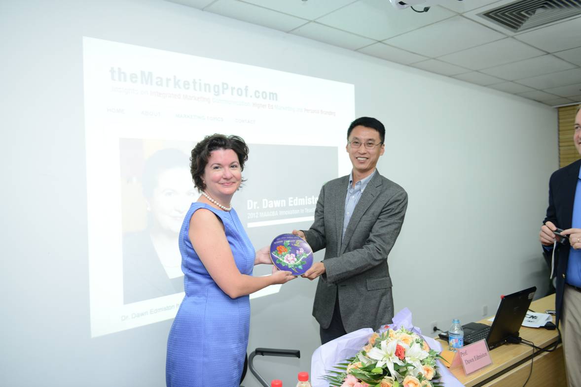 Edmiston教授首先用了席琳迪翁和棒球两个例子,阐明perfect pitch的两个基本意义“完美高音”和“完美投掷”,从而将perfect pitch的概念引入职业(个人)品牌领域。重点强调在职场环境中,毕业生正如棒球投球手一样,将自身讯息投向了自己未来的雇主(如棒球接球员)。在此过程中,毕业生将什么样的讯息投递未来雇主的问题凸显的非常重要。拥有什么样的头衔,有过怎样的工作经历并不是十分关紧,更为重要的是应该将那些被未来雇主看重的、欣赏的讯息传递给他们。Edmiston教授希望通过今晚的讲座,大家可以获得这些技能,加以思索,最终达到自己事业的制高点。接着,她引入了两个与个人品牌概念紧密相关的两个术语“品牌承诺”和“品牌要点”。最后,Edmiston教授讲述了在网络时代背景下,如何利用网络特别是社交网络建立自己良好的个人品牌。