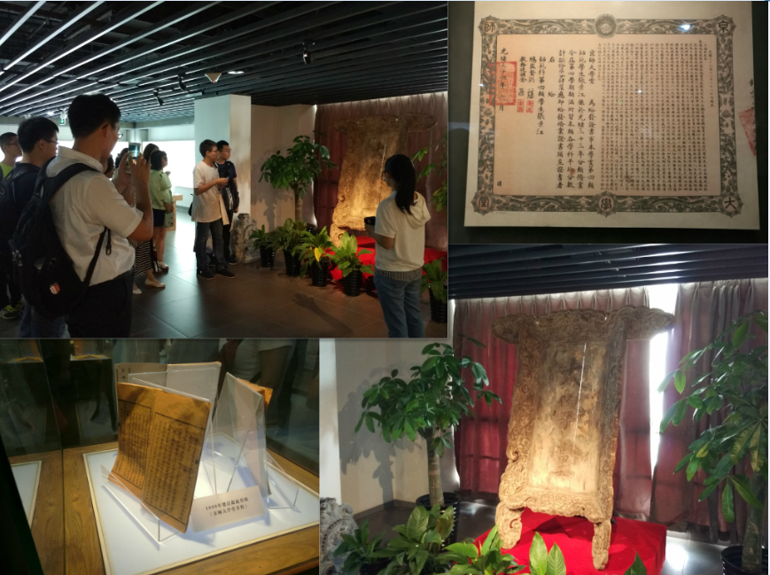 校史厅展示了北师大自1902年以来的发展沿革和国家历届领导人对师大的亲切关怀,一幅幅老照片,一份份珍贵的文献,一件件针对的文物,同学们都看得认真仔细,并不断与讲解员交流。在入门口附近的“大学堂”复原匾额前同学们驻足良久,饱经风霜的匾额静静述说着京师大学堂的创立及历史流变,展示了师大悠久的历史和厚重的底蕴,深深震撼了每一位同学。