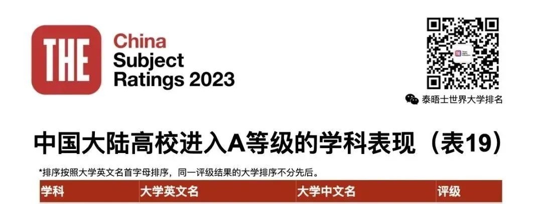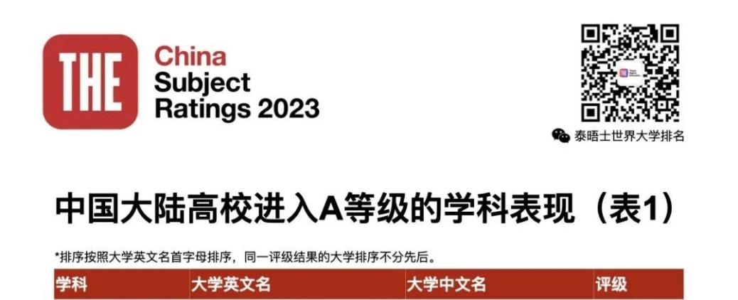 泰晤士高等教育中国学科评级于2020年推出,是唯一基于中国教育部83门学科分类标准来衡量大学表现的评级,它将中国高校与全球高校——来自104个国家或地区的1,777所大学进行比较。