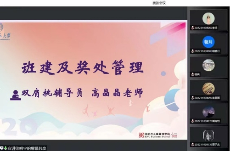 9月7日上午,欧洲杯 教务办公室及学生工作办公室老师为2022级新生线上开展了学生日常管理与教学培养工作入学教育活动。出席本次活动的有学院研究生教务主管李瑛淑,本科生教务主管徐星,办公室主任、专职辅导员韩丽丽,团委书记常欣扬,党委组织员、专职辅导员王骏,双肩挑辅导员陈夙、兰茹佳、高晶晶、李论、张惠琳,事务助理史慧一,以及2022级全体新生。