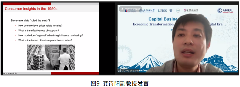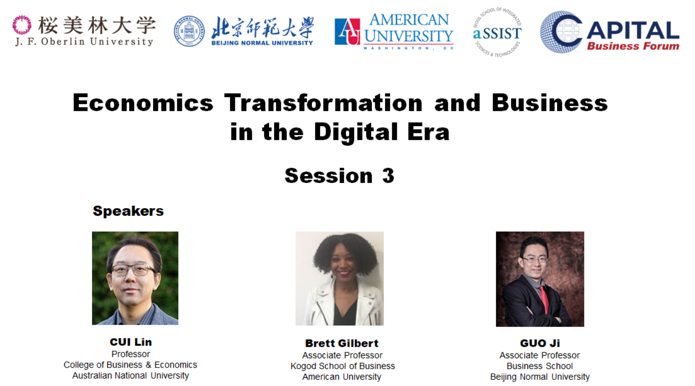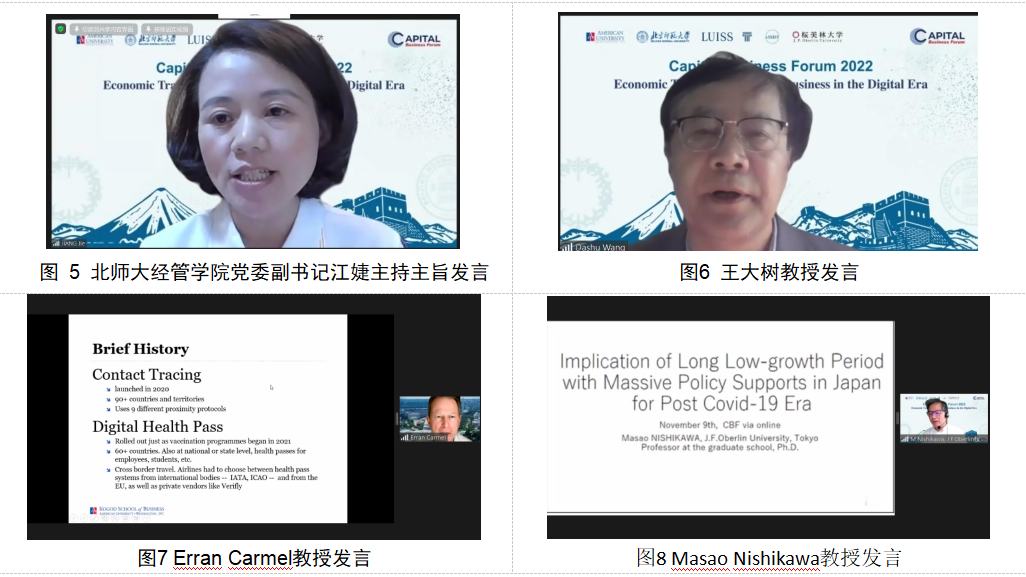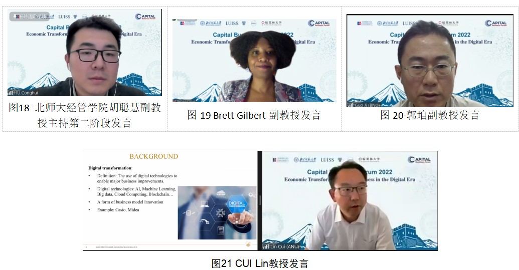 第一阶段主旨发言由北师大经管学院党委副书记江婕主持。Masao Nishikawa以“Implication of Long Low-growth Period with Massive Policy Supports in Japan for Post Covid-19 Era”为题,结合自己逾30年在日本内阁府的工作经历和学术研究,指出面对疫情后长期经济的低增长,政府应该保持政策扶持和弹性,帮助社会恢复活力。Erran Carmel教授以“Pandemic Megasystems: A New Framing and Lessons from Failures”为题梳理了全球90余个国家面对新冠疫情的应当方案和做法,总结经验与教训,提出期望构建全球防疫新框架。王大树教授以“Increase the Non-contact Elements, Develop Beijing's Digital Economy”为题结合北京的防疫实践,建议推进首都经济无接触元素的拓展,以数字经济缓解和应对疫情带来的冲击。龚诗阳副教授进行了“Powering Consuming Insights in a Digital World”的演讲,分享了在数字经济时代如何促进消费理念转变的研究成果和观点。