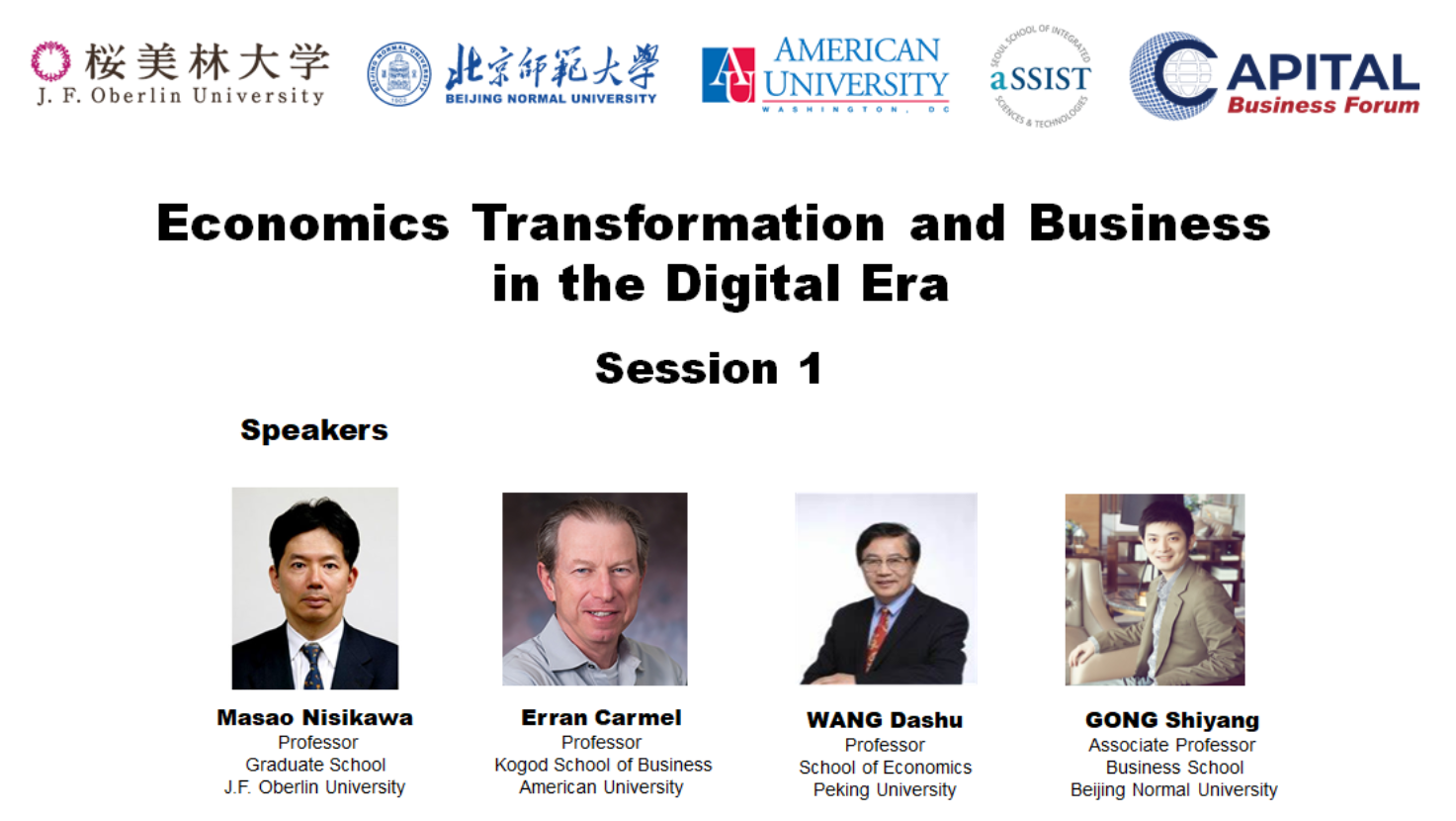 日本樱美林大学校长Hiroaki Hatayama,日本内阁官房原次官、内阁经济社会研究局原局长Masao Nishikawa,日本明治大学原副校长、樱美林大学教授Tsuneo Sakamoto,日本国际大学原校长KimioKase,欧洲杯 院长戚聿东,北京大学经济学院教授王大树,美国美利坚大学Kogod商学院原院长Erran Carmel、副教授Brett Gilbert,韩国政府投资通商大使、首尔综合科技大学讲席教授、首尔国立大学国际大学院原院长Hwy-Chang Moon、YIN Wenyan博士,澳大利亚国立大学经济与商业学院副院长CUI Lin教授,樱美林大学研究生院院长Sakai Mutsumi、任云教授,以及北师大经管学院党委副书记江婕、副院长蔡宏波,教师代表郭垍、钱婧、胡聪慧、龚诗阳等共同出席论坛。今年论坛的主题是“数字时代的经济转型与企业发展(Economic Transformation and Business in the Digital Era)”。