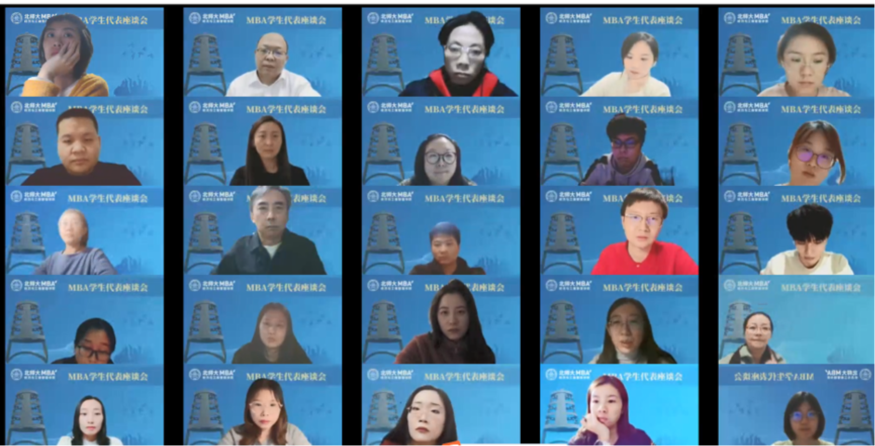 在各班学生代表及MBA学生联合会代表交流环节,大家敞开心扉、畅所欲言,学生代表纷纷表达了对学校当前疫情防控工作的充分理解、肯定和支持,也从课程安排、线上考试形式、实践学分取得、就业毕业、学生活动开展、师生沟通渠道等方面提出了有质量、有见地的意见和建议,如:线上课堂效果的完善、线上考试流程的优化、选课系统的改进、信息及通知的发布及沟通渠道的畅通、疫情影响下国内外交流及企业参访等实践活动的落实、学生活动的丰富、京外学生的入校上课、毕业后校友资源的利用等。
