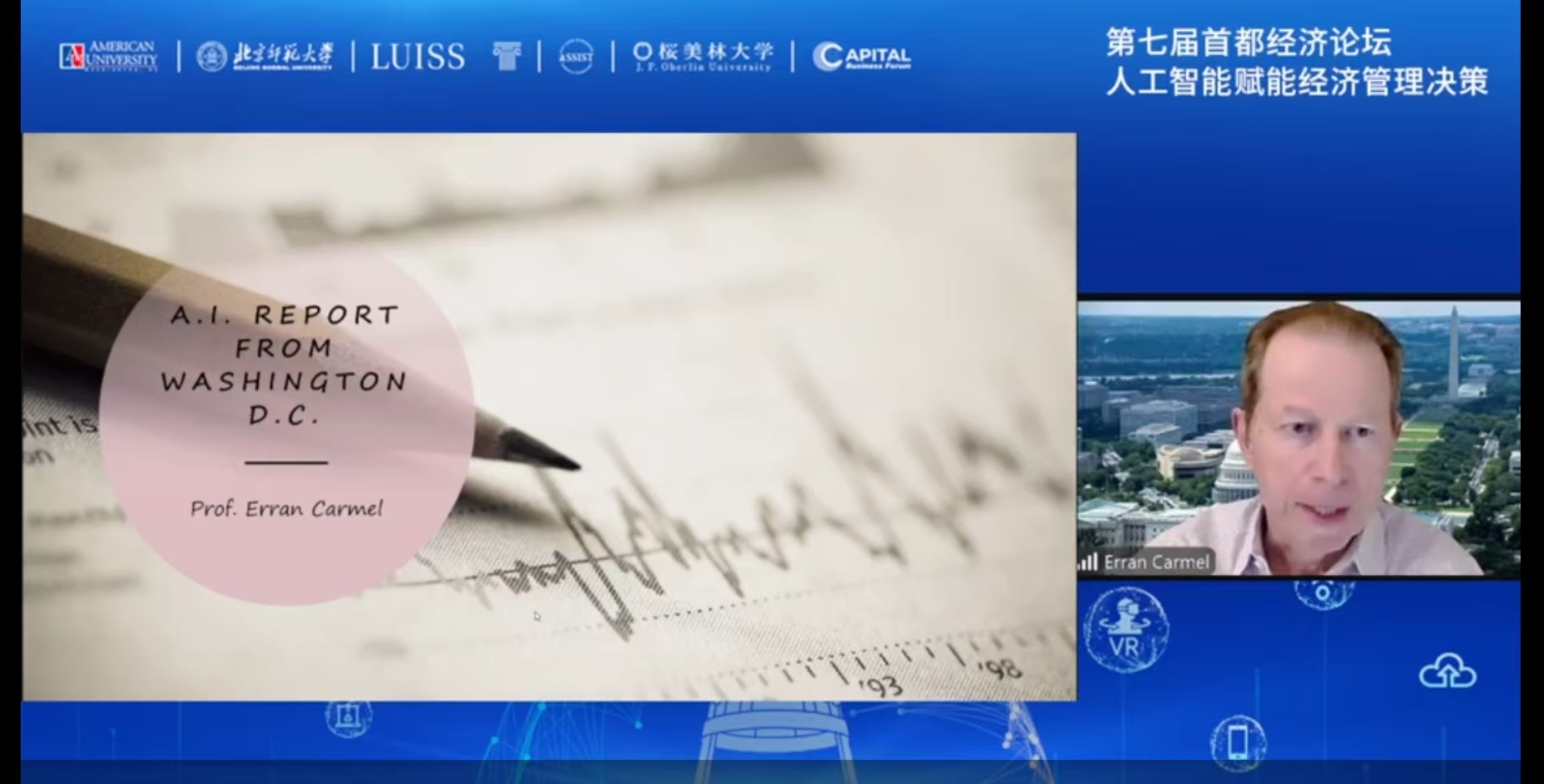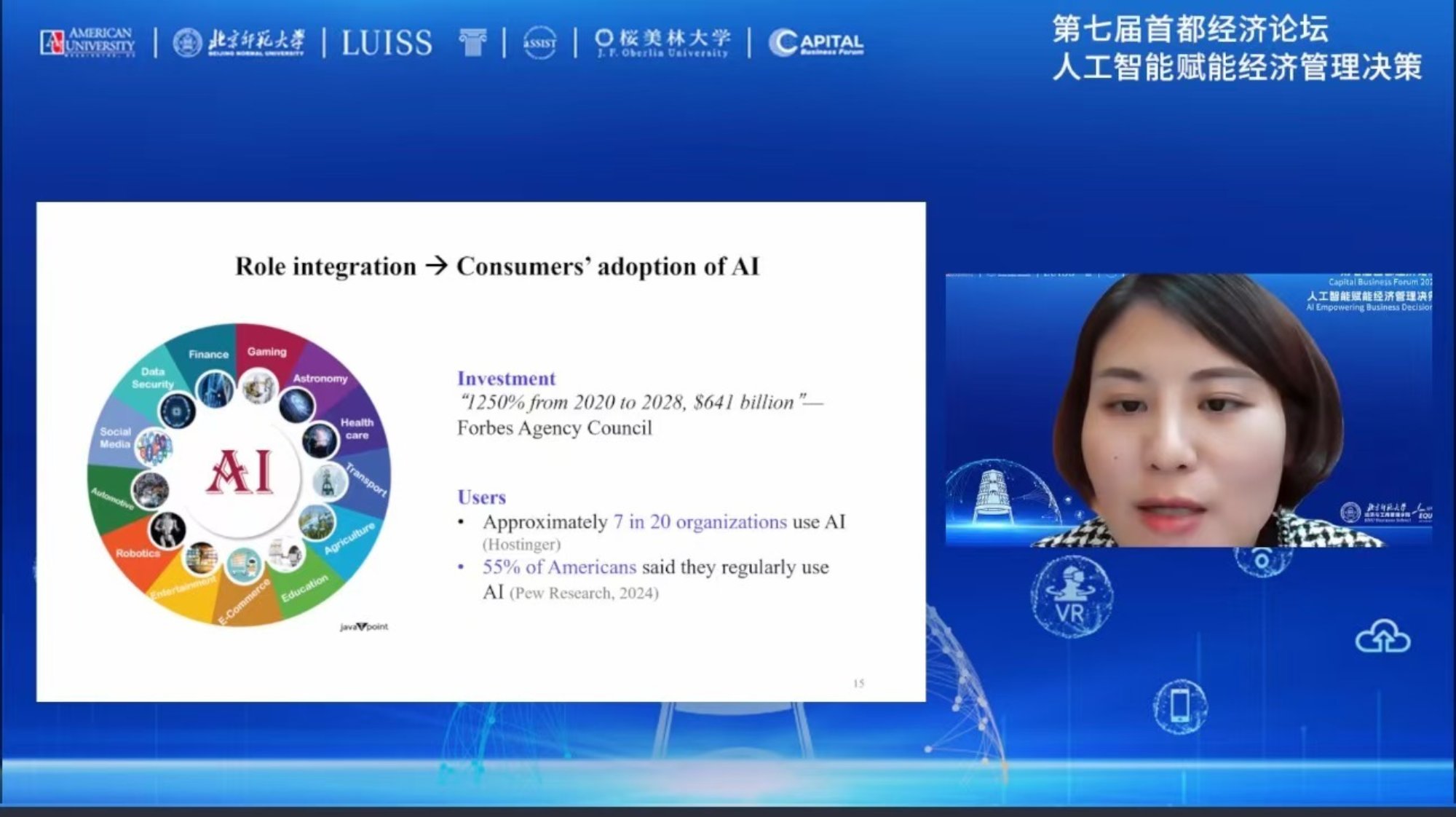 上午的主会场由北师大经管学院副院长胡聪慧教授主持,学院党委书记孙志军教授和美利坚大学商学院(Kogod Business School,American University)弗兰·卡梅尔教授分别致辞。孙志军对各位嘉宾的出席表示热烈的欢迎,对一直以来关心和支持北师大经管学院发展的社会各界朋友表示感谢。人工智能等新技术大幅提升了人类认识世界和改造世界的能力,也同时带来了机遇和挑战,本次论坛的选题是体现了学院对当前科技发展趋势的深刻洞察和推动经管学科数智化转型的坚定信念。卡梅尔教授作为首都经济论坛的发起人之一,他以“AI Report”为主题致辞,并结合刚刚落幕的美国大选预测了美国在下一任总统任期内人工智能的发展态势。