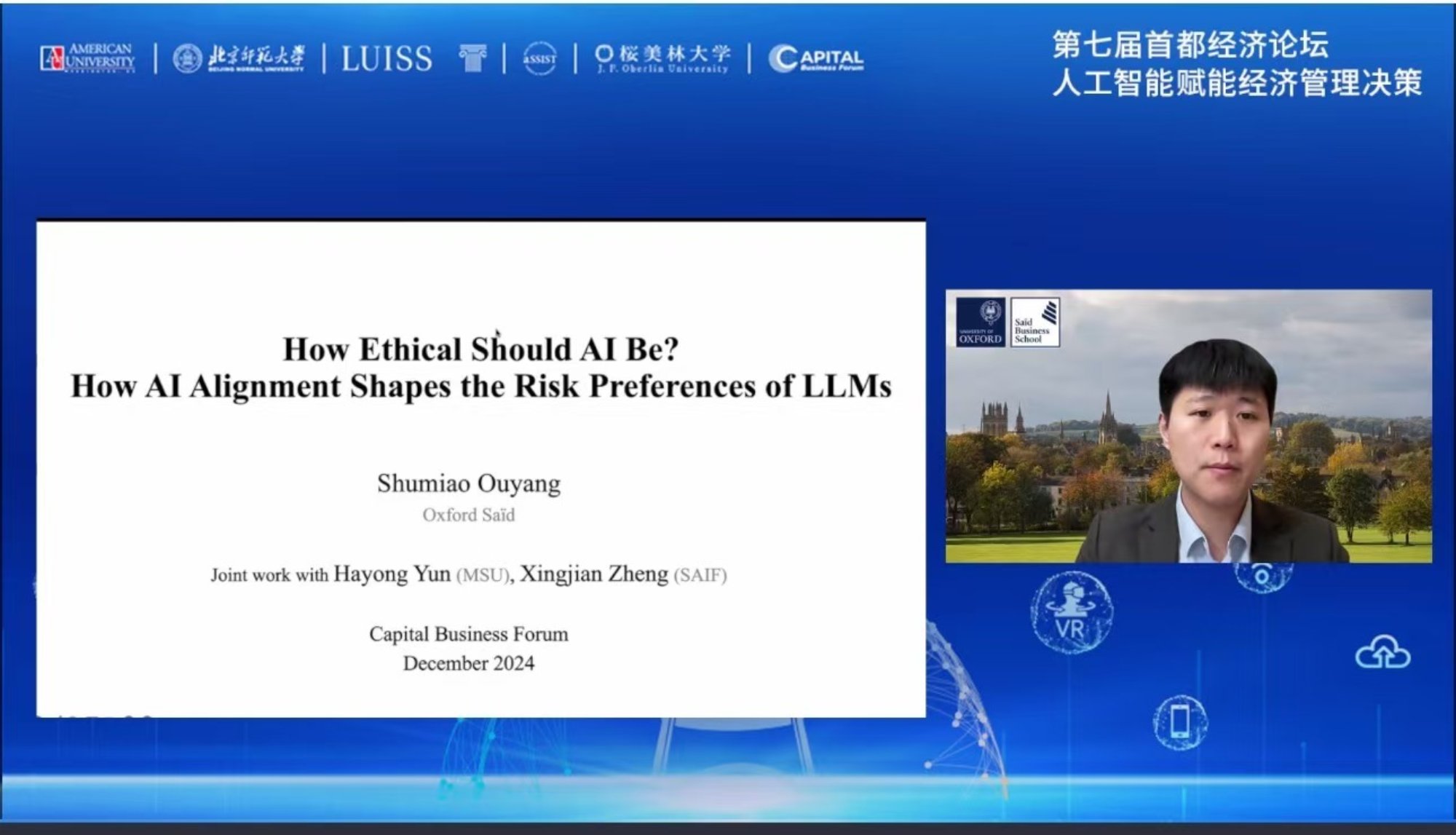 牛津大学助理教授欧阳书淼以“How Ethical Should AI Be? How AI Alignment Shapes the Risk Preferences of LLMs”为题,围绕着“人脑的决策过程”“大语言模型的决策和分析”做了分享,重点突出了两者在进行决策的过程中都受到了“风险偏好(Risk Preference)”这一因素的影响。他指出,大型语言模型(Large Language Models,LLMs)不是伦理中性的,对齐(Alignment)对于金融决策有显著影响,且对齐的程度需要根据具体金融应用进行仔细校准。