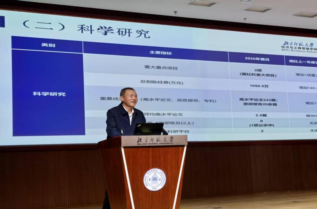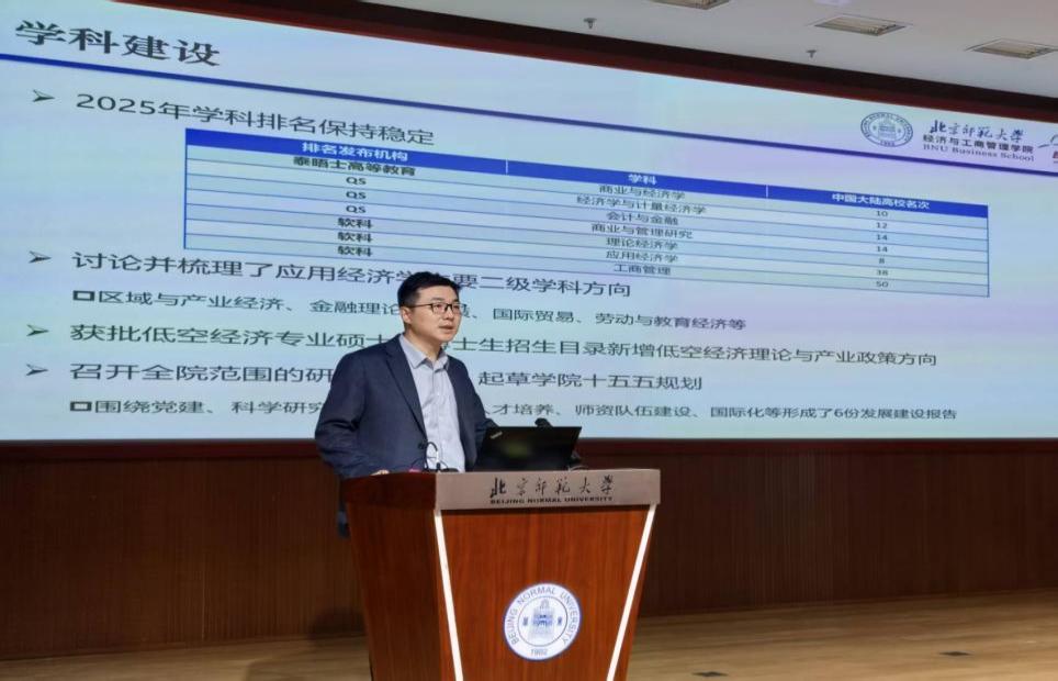 最后,院长戚聿东代表学院行政班子总结了2025年学院发展成效,就未来五年规划主要目标和关键指标进行了说明。他表示,2025年学院在人才培养、学科建设、科研产出、国际化办学等关键指标上均实现了稳步提升,特别是在国际认证、国家高层次人才建设和国家重大科研项目等方面取得了显著成绩,圆满完成学院“十四五”规划各项目标和指标。展望“十五五”时期,学院将实施“学科跃升、人才强院、国际引领”三大工程,通过“战略、学科、育人、开放”四个维度的深度融合,朝着具有人文底蕴和国际影响力的一流经管学院愿景再上新台阶。