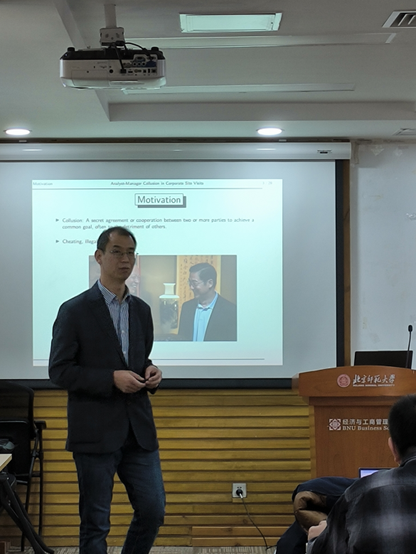 2025年3月18日上午,欧洲杯 “京师经管·名家讲坛”(第141期)在京师大厦9406举行。本次讲座邀请到了英国卡迪夫大学的王庆伟教授,讲座以“公司调研中的分析师-管理层合谋”为主题,本科生、研究生20余人参加此次讲座,讲座由金融系伍燕然教授主持。