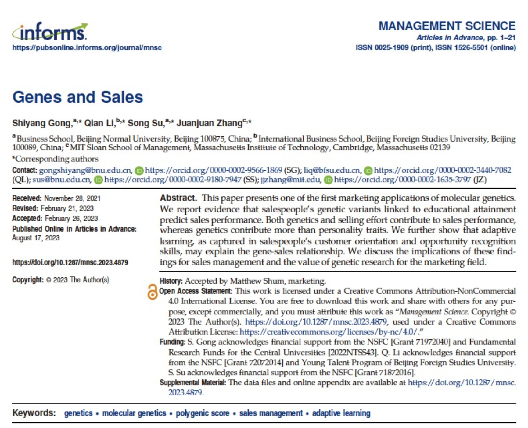 Shiyang Gong, Qian Li, Song Su, Juanjuan Zhang (2023) Genes and Sales. Management Science, //doi.org/10.1287/mnsc.2023.4879.