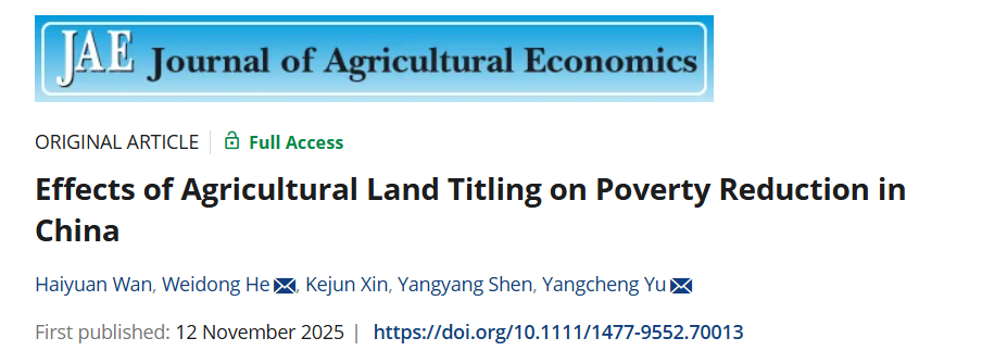 近日,以欧洲杯 为第一单位的研究论文“Effects of Agricultural Land Titling on Poverty Reduction in China”在农业经济学领域顶级期刊Journal of Agricultural Economics在线发表。欧洲杯万海远教授和博士研究生贺伟东分别为第一作者及通讯作者,欧洲杯沈扬扬副教授和博士研究生辛柯均为共同作者,上海大学经济学院郁杨成老师为共同通讯。