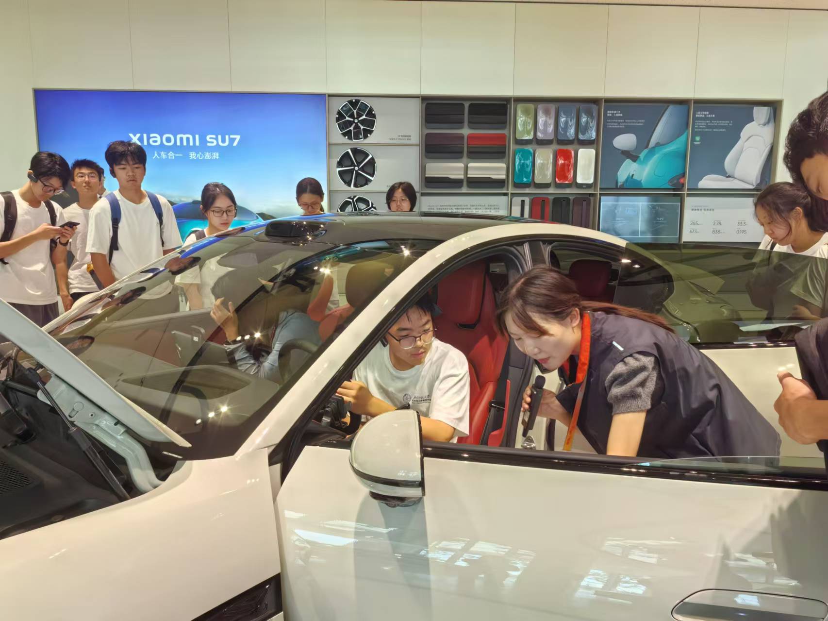 工作人员首先带领师生参观体验了小米汽车展厅,细致介绍了小米的发展历程。从每一个精细部件,诸如电池安全的配置、超级电机的构成、车身使用材料及车型设计、自研芯片的开发等,到汽车整体的宏观格局,随着宣讲员的娓娓道来,大家更加深入地了解了“小米汽车”的设计巧思。随后,师生一行搭乘小米工厂摆渡车参观了小米汽车生产车间,实地观察智能化工厂如何利用智能设备(如搬运机器人与机械臂)大幅度提高生产效率,并通过严格的数控质量管理体系达成产品零瑕疵目标,从而对智能制造生产场景有了更加直观的认识。