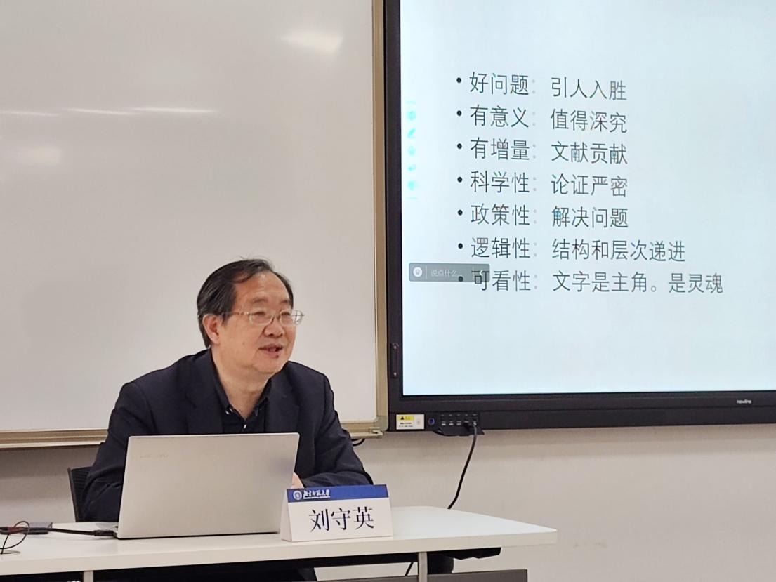 教育部“长江学者奖励计划”特聘教授、中国人民大学经济学院原院长刘守英作《做好科研的几个基本功》专题讲座。他概述了当今学者撰写科研论文的现状,指出了青年学者科研活动存在的问题,讲解了开展实地调查的方法和以问题导向的研究方法。最后,刘守英教授结合国家政策就如何做一个好的政策咨询者提出了建议,强调青年学者要提高政治站位,强化使命意识,打磨科研基本功,以高质量的科研成果服务国家重大需求。
