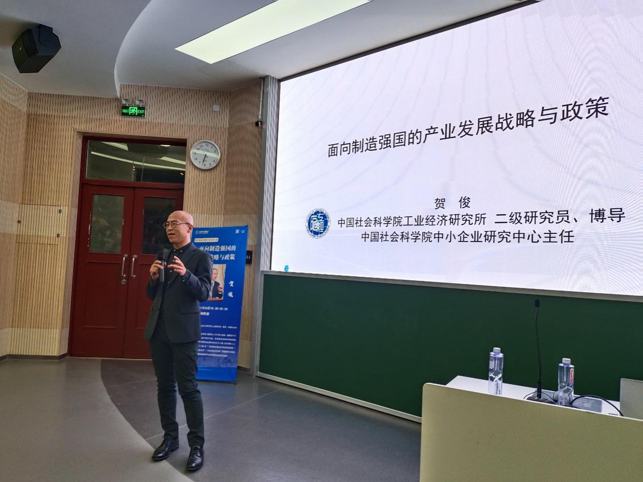 2023年11月26日晚,欧洲杯 “数字经济与管理大讲堂”第24讲《面向制造强国的产业战略与政策》在电子楼阶梯教室举办。本次讲座特邀中国社会科学院工业经济研究所二级研究员、博导、中国社会科学院中小企业研究中心主任贺俊主讲, MBA教育中心副主任李静主持,近200名学生到场聆听。
