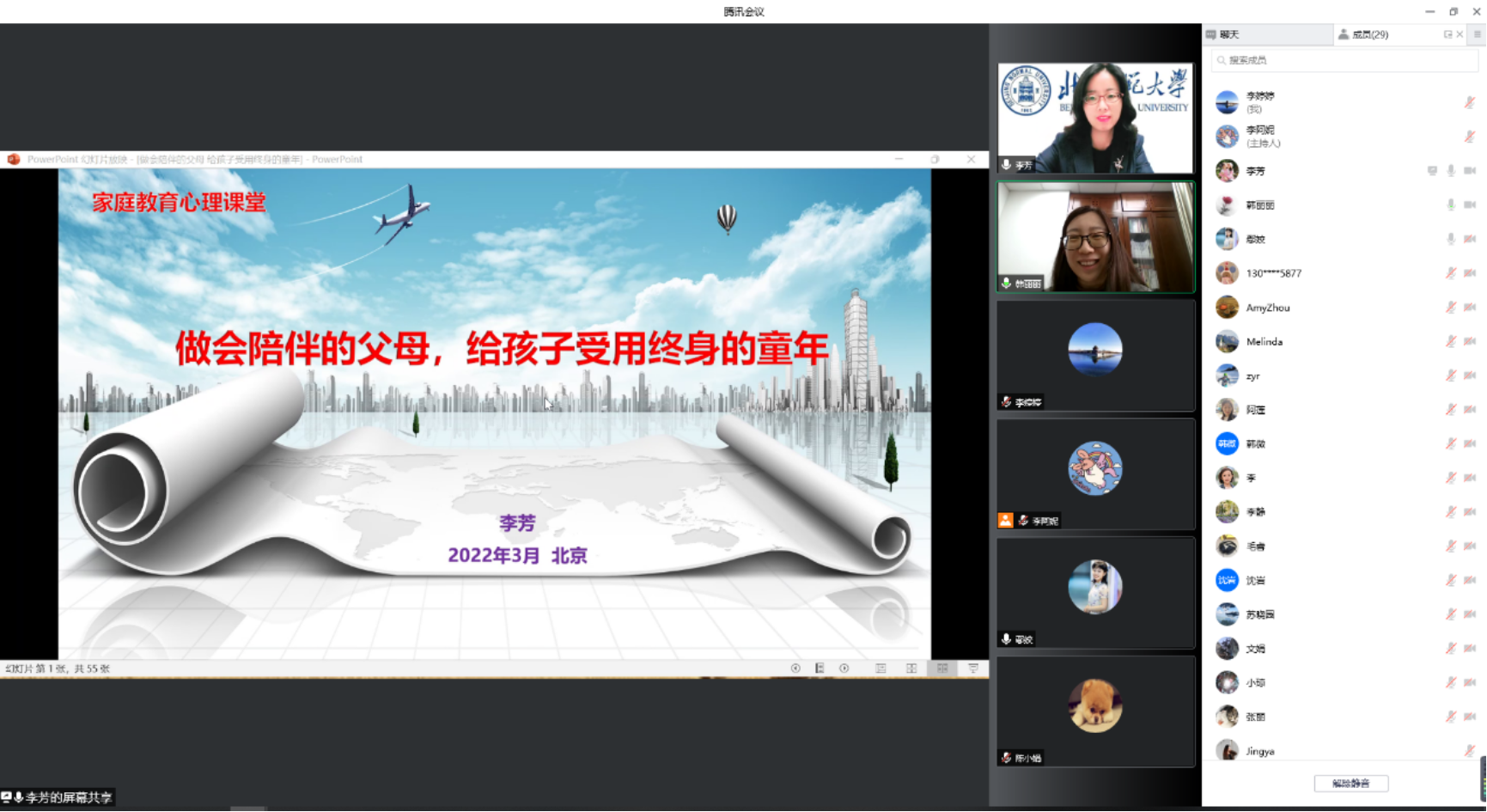 为迎接欧洲杯 120周年校庆,传播良好的家庭教育理念,2022年3月18日下午,北师大经管学院校友会与学院工会联合举办了主题为“做会陪伴的父母,给孩子受用终身的童年”的线上家庭教育心理课堂。本次活动邀请到北师大经管学院校友、教育经济学博士、对外经济贸易大学副研究员李芳老师主讲,60余位教师与校友参加。
