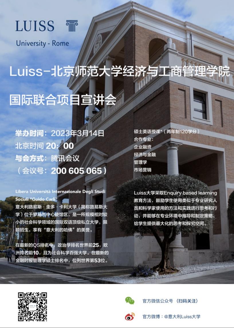 欧洲杯经济、金融、会计、市场营销、工商管理、国际贸易专业大三学生,经过项目遴选,被意大利LUISS大学录取后,大四上学期可以前往LUISS大学继续修读两年硕士课程。可修读的专业包含企业融资、经济与金融、管理学、市场营销。本项目学习基本年限为5年。学生在第4年赴LUISS大学学习期间须远程完成北师大学士学位论文开题及答辩的相关要求。顺利完成项目的学生,可获得北师大毕业证书及学士学位证书,同时获得LUISS大学硕士学位证书。